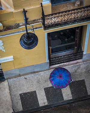 Shot from the top of the person walking with open umbrella under the rain. Black and white print available